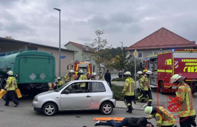 Die zweite Übungseinheit beinhaltete für eine Gruppe die theoretische und praktische Auseinandersetzung mit einer Brandmeldeanlage sowie einer fest verbauten Steigleitung – für viele jüngere Feuerwehrleute eine spannende Erfahrung. Die andere Gruppe wurde zu einem Verkehrsunfall mit einem PKW und einem Tanklastwagen alarmiert. Vier verletzte Personen – darunter ein bewusstloser LKW-Fahrer, ein unter dem LKW eingeklemmter Fahrradfahrer und ein eingeklemmter PKW-Fahrer – mussten betreut und mit technischer Hilfe befreit werden. Beide Gruppen gingen mit unterschiedlichen Ansätzen vor, konnten aber alle Personen zügig retten.